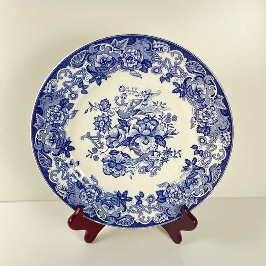Set de 8 assiettes plates en faïence bleue, décor floral et oiseaux, début XXe