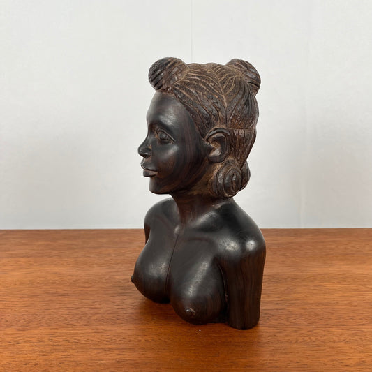 Buste féminin sculpté à la main en bois noir — art tribal vintage