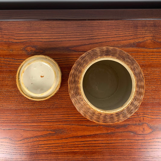 Ancien bocal à gingembre asiatique en céramique et osier tressé à la main