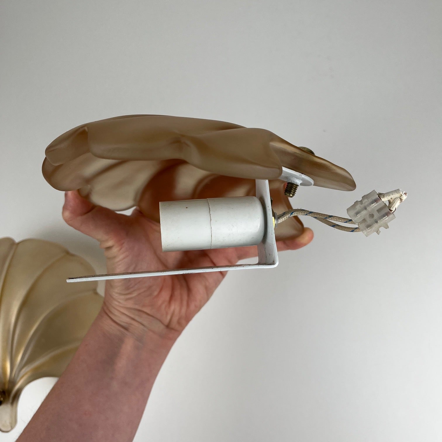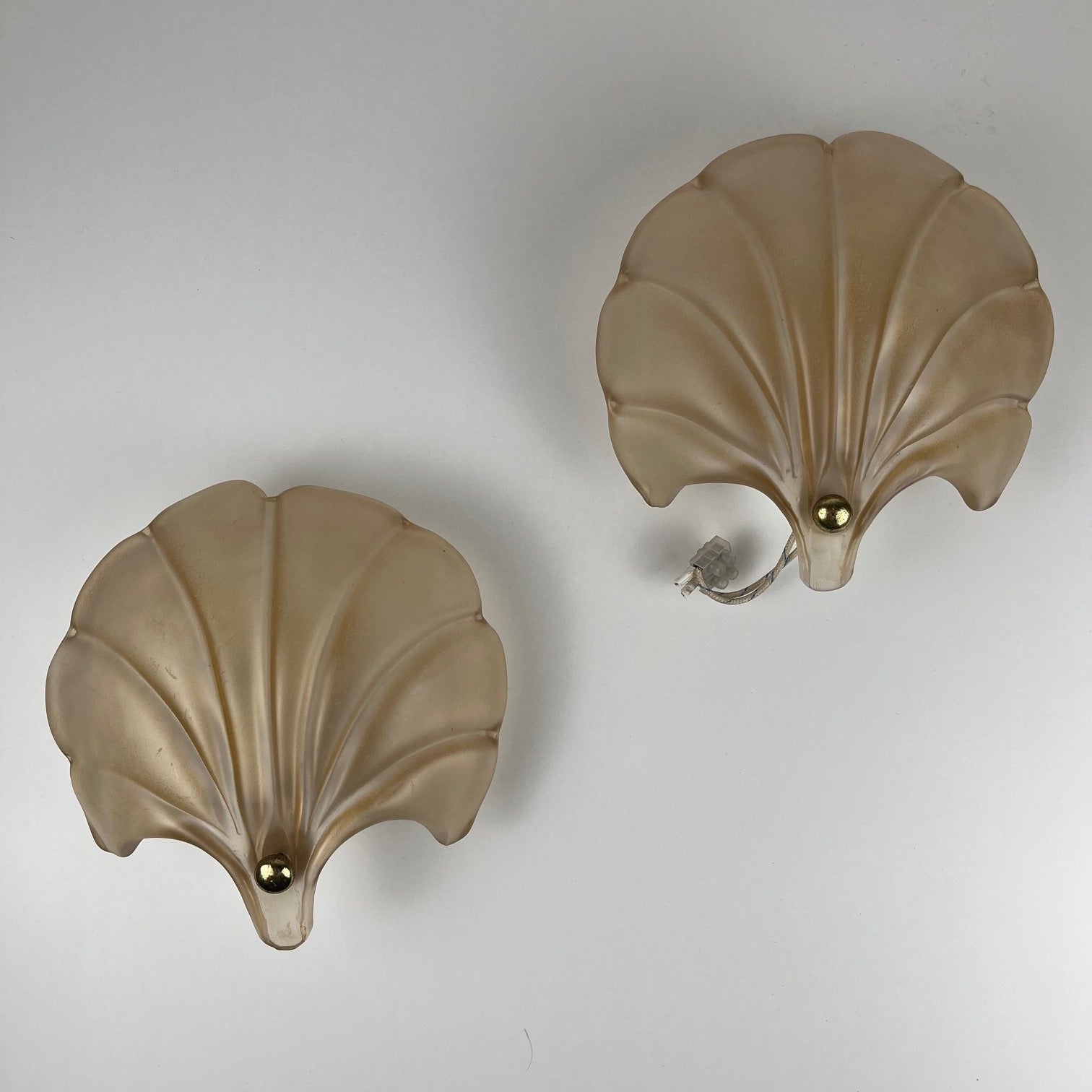 Superb pair of vintage shell-shaped wall sconces, in frosted beige/old pink molded glass paste, in an elegant and timeless art deco style.