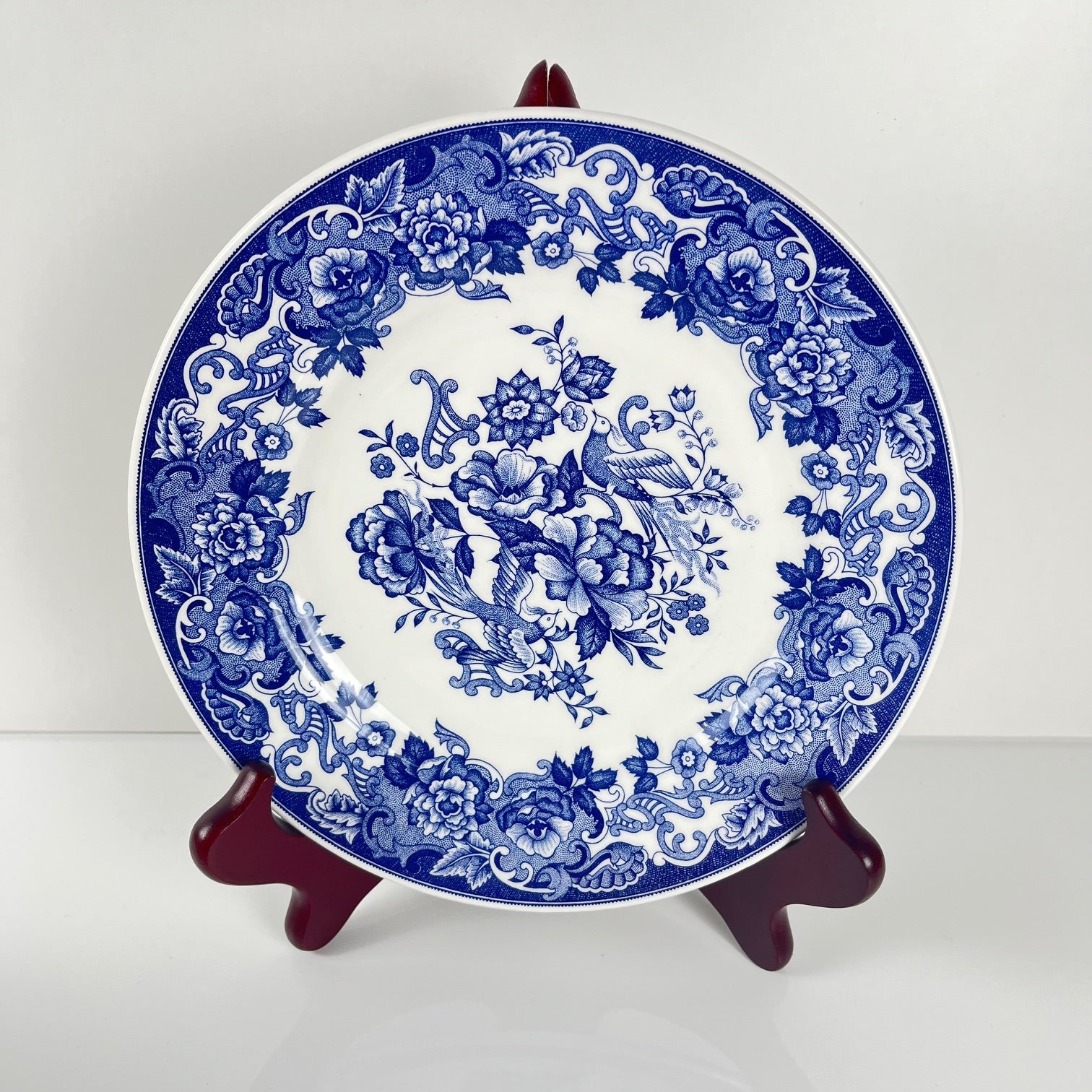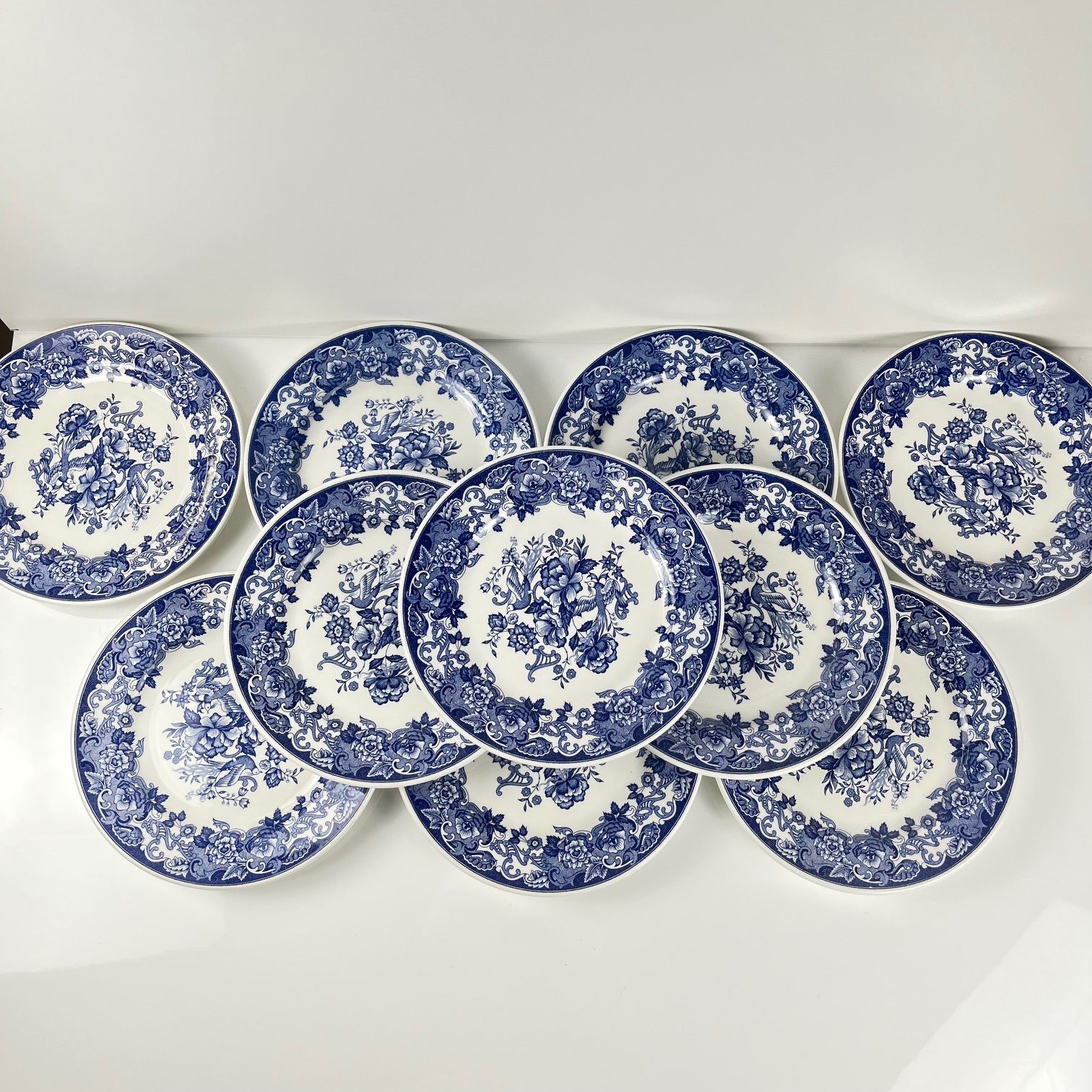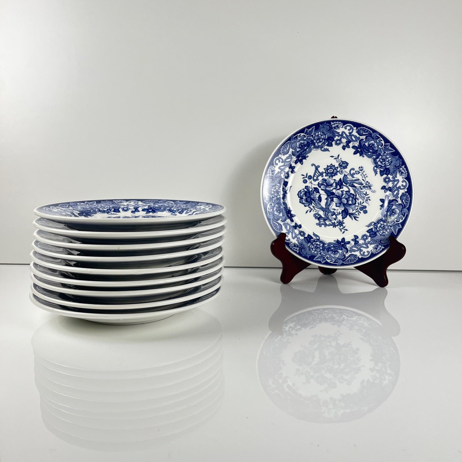 Elegant set of 10 antique dessert plates in blue earthenware, decorated with floral and bird transfer.