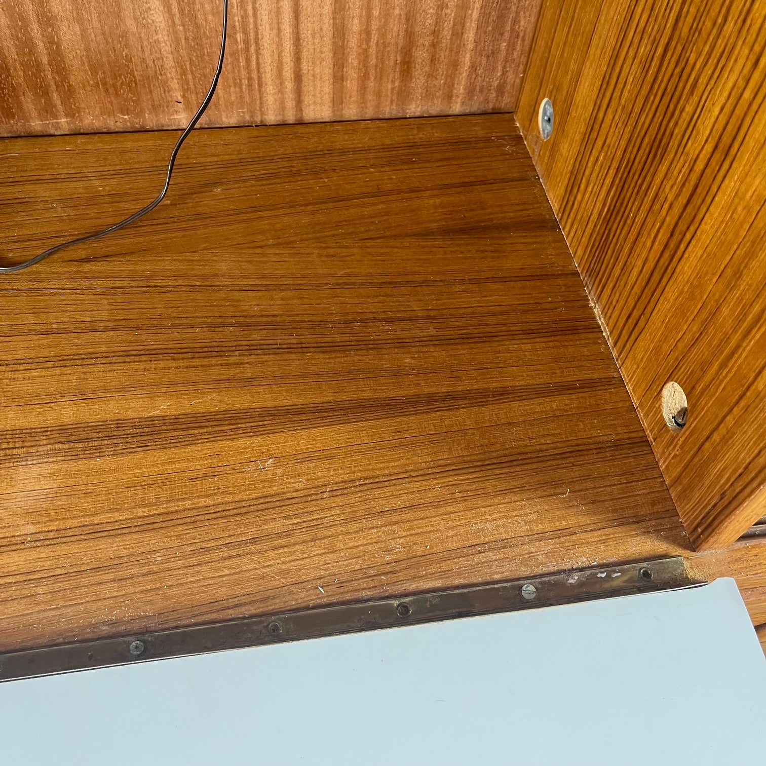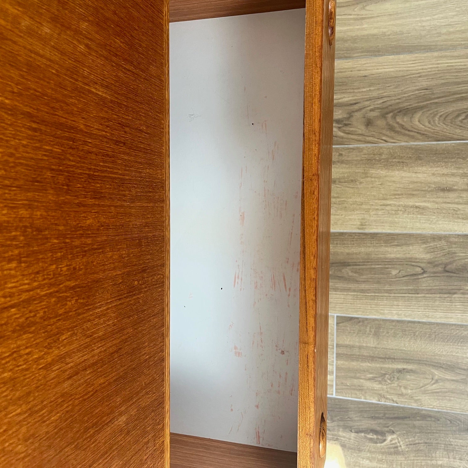 4 tiroirs, 1 espace ouvert avec 1 étagère, un espace bar avec porte battante avec 1 étagère et lumière à brancher + ampoule