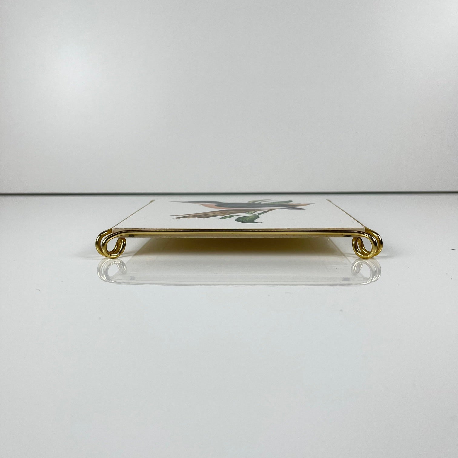 ancien carreau Motif oiseau Sittelle Torchepot monté en dessous de plat avec un cadre en laiton doré