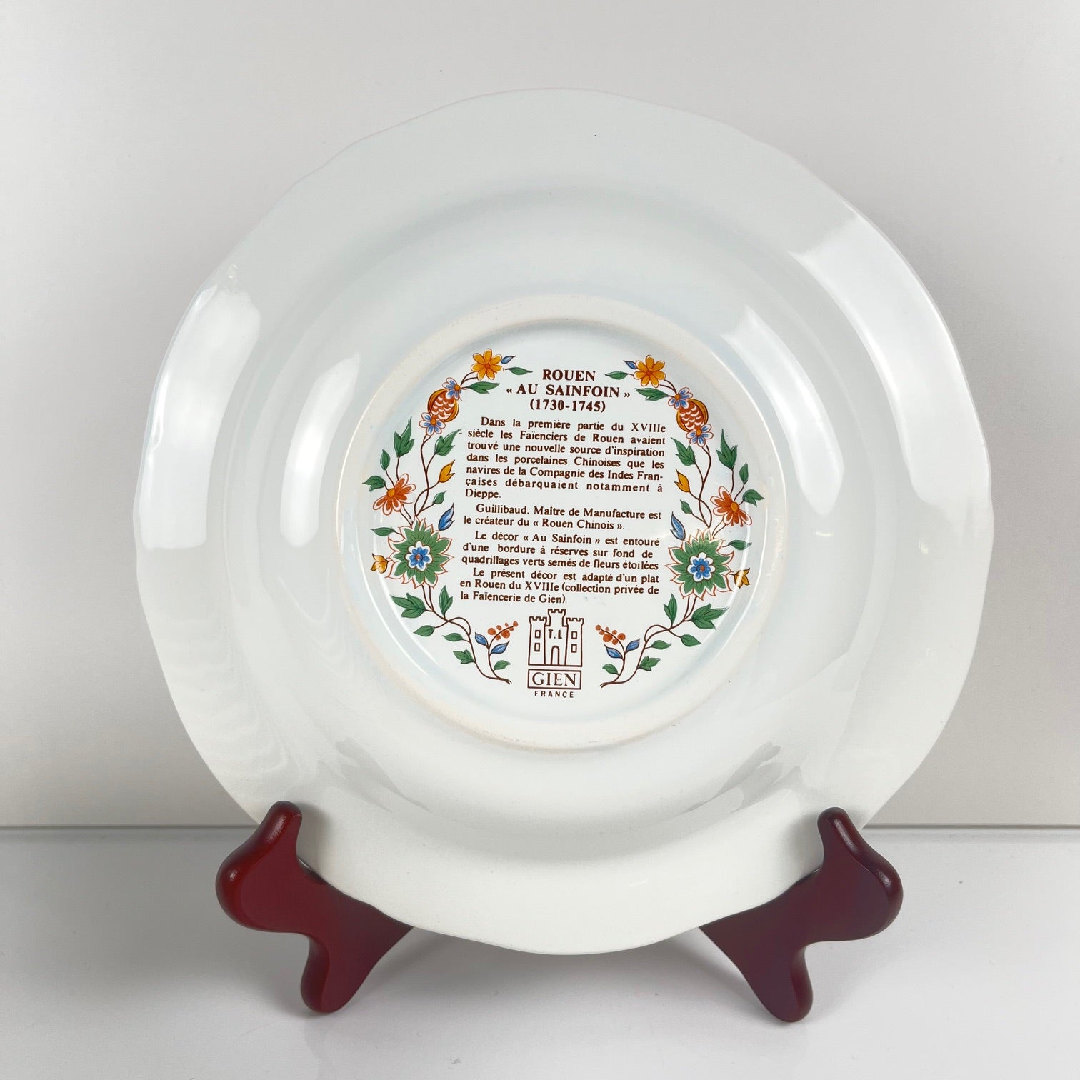 Ce décor s’inscrit dans la grande tradition faïencière de la manufacture de Gien, fondée en 1821. Inspiré des célèbres décors de Rouen du XVIIIe siècle, le modèle Rouen Sainfoin revisite les motifs floraux et rinceaux classiques dans une interprétation riche et raffinée.