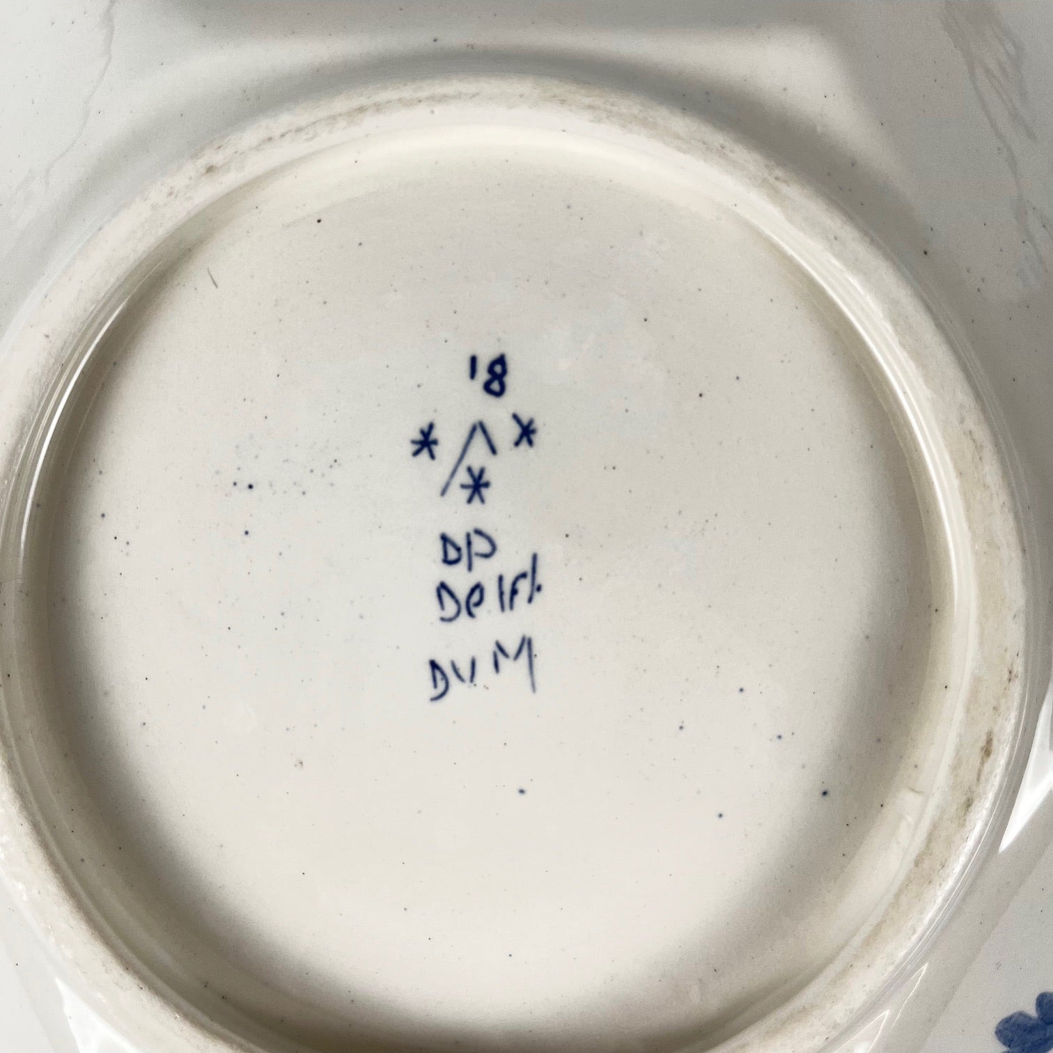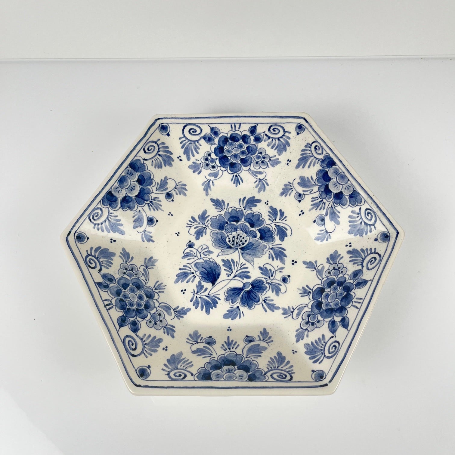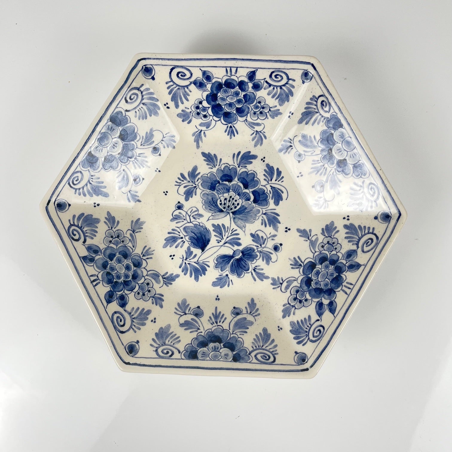 Plat creux en faïence de Delft, décoré à la main d’un élégant motif floral bleu sur fond blanc. De forme polygonale, il présente un décor traditionnel typique de la manufacture hollandaise Royal Delft (marque DUM, signé au revers).
