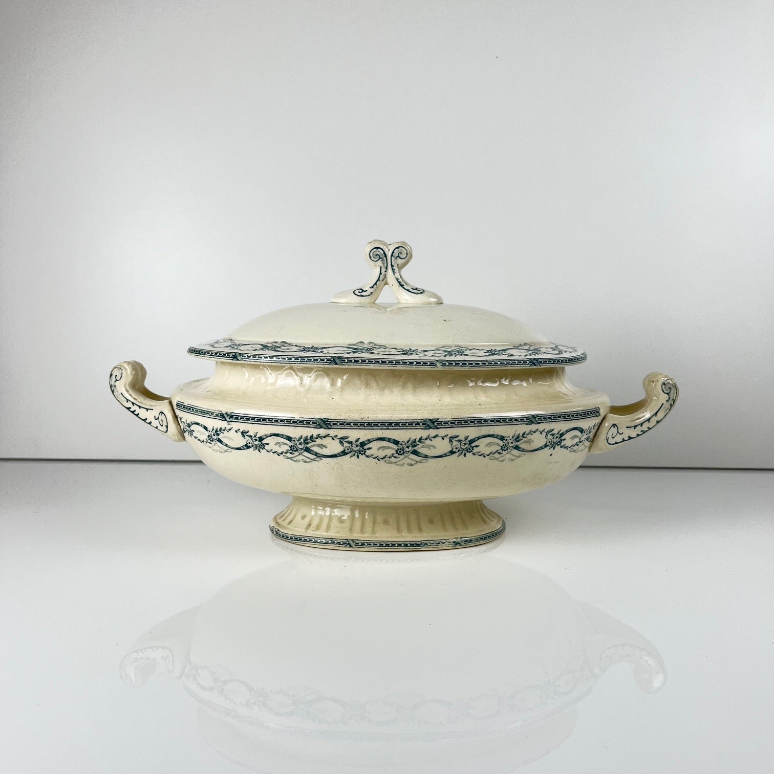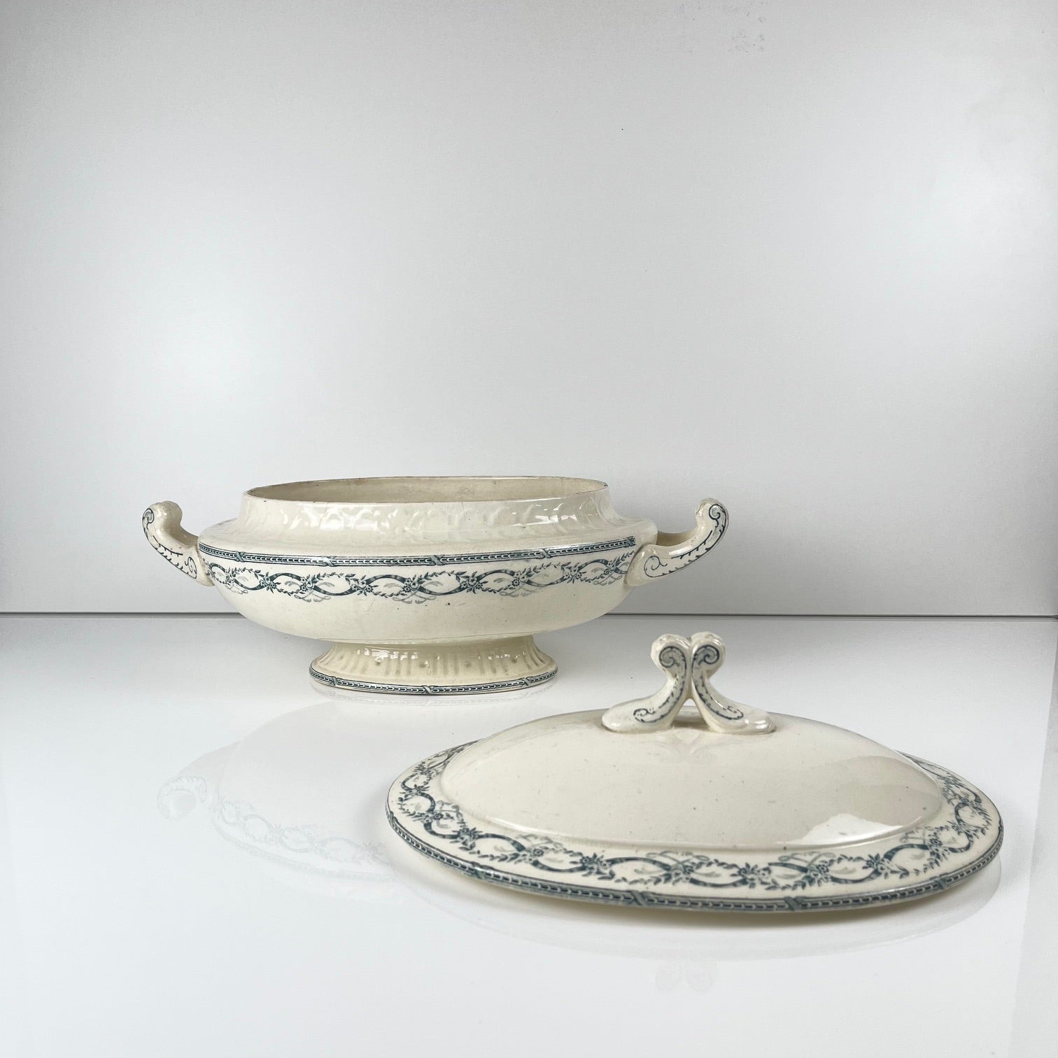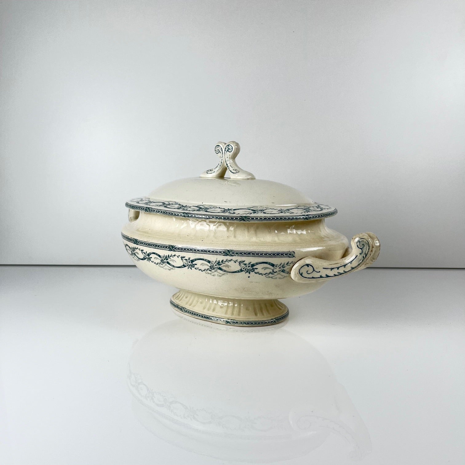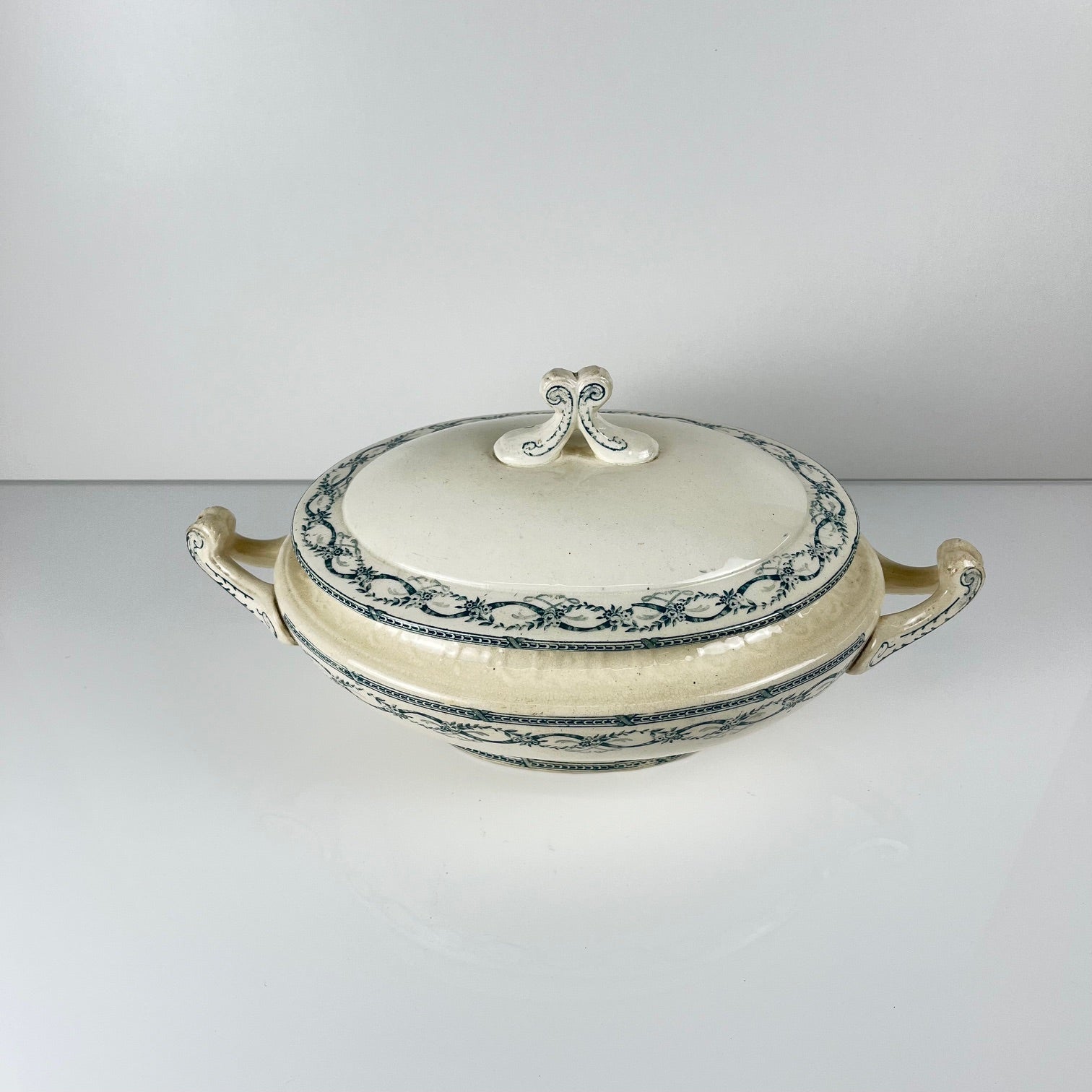 Soupière complète avec couvercle, forme galbée, anses ornées, motif de guirlandes en transfert bleu-vert.