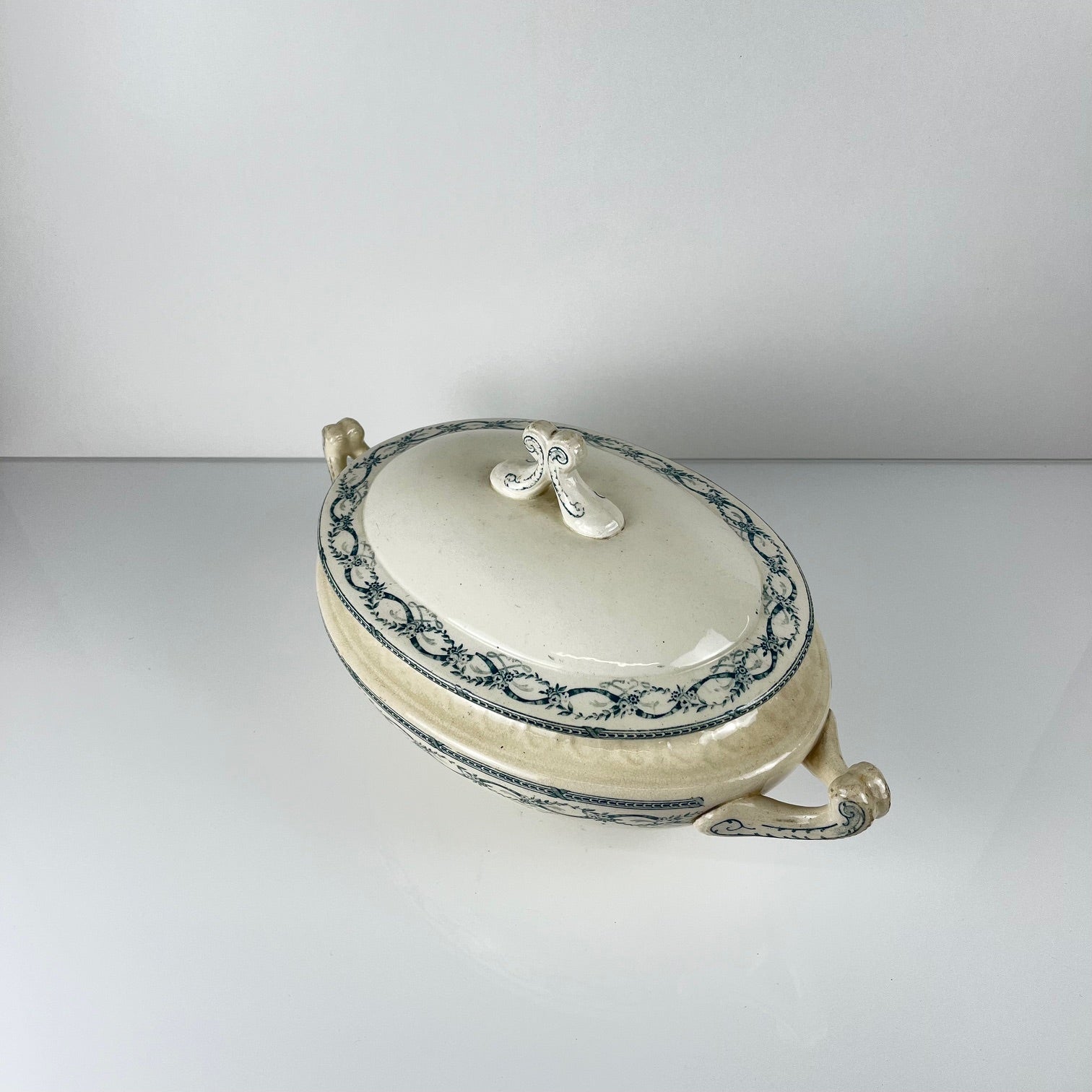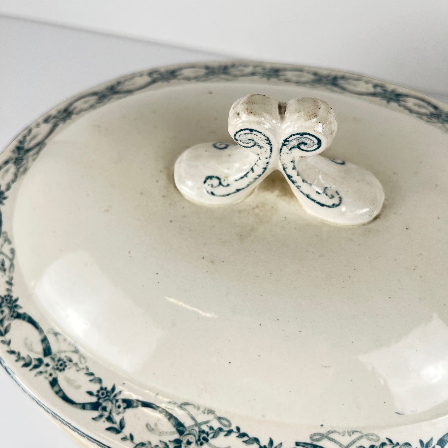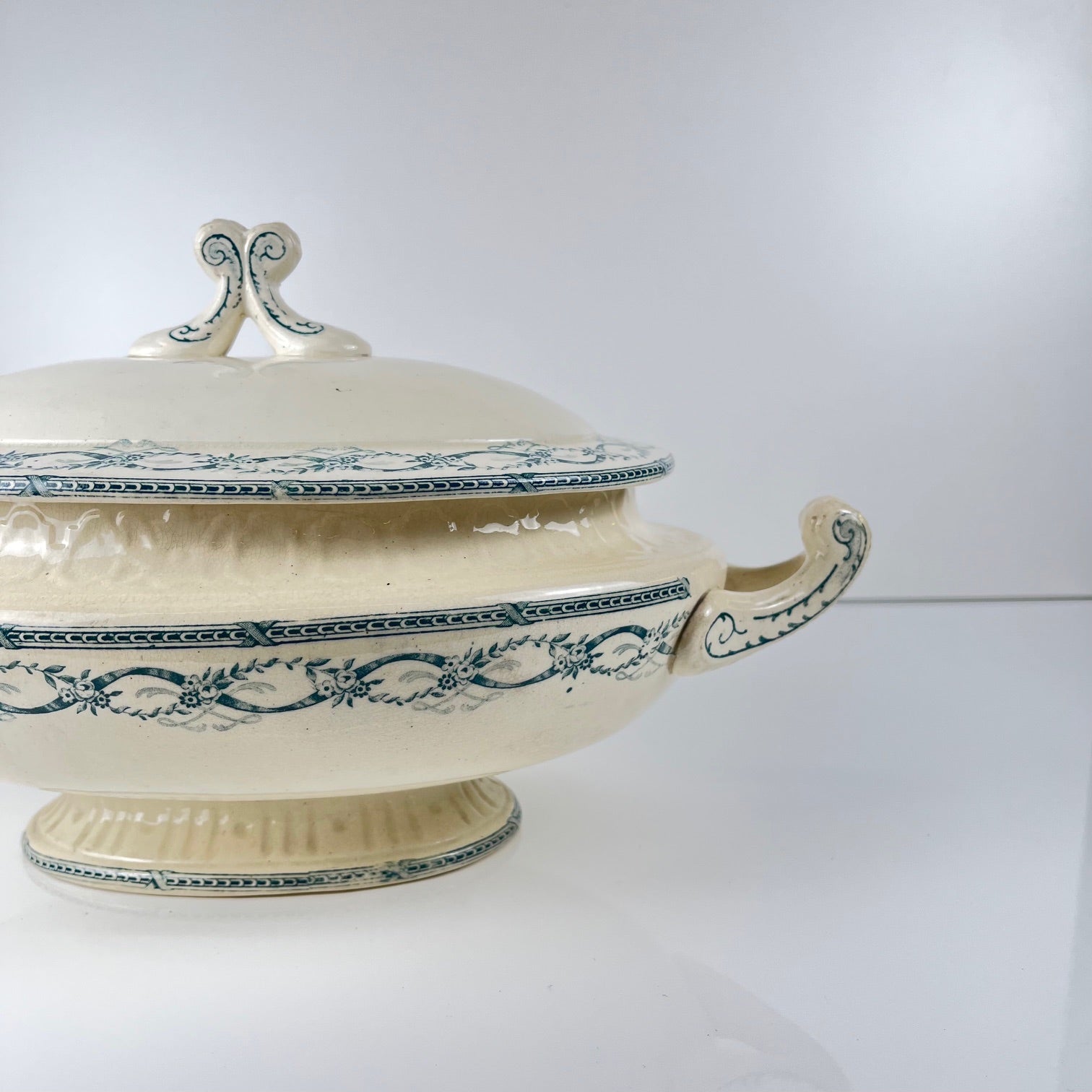 Soupière complète avec couvercle, forme galbée, anses ornées, motif de guirlandes en transfert bleu-vert.