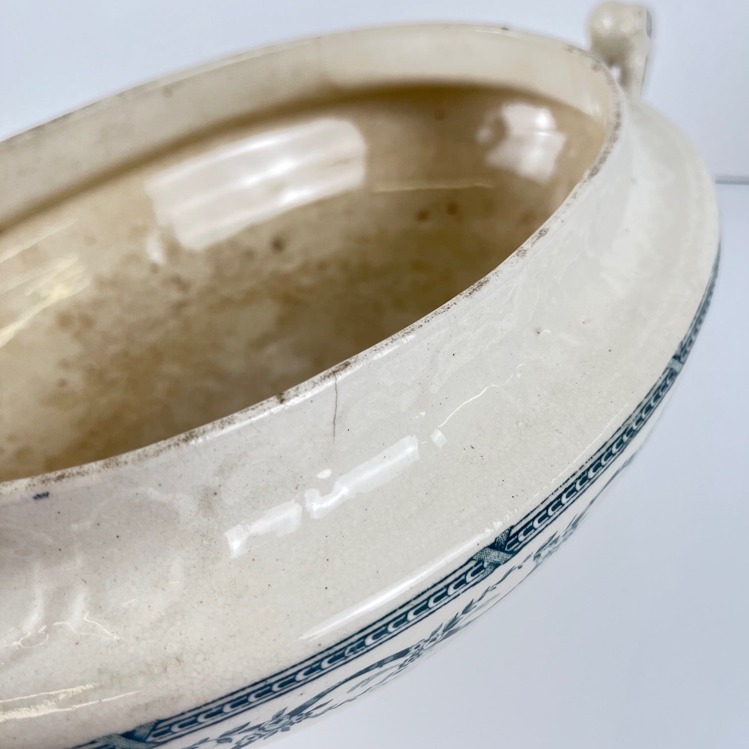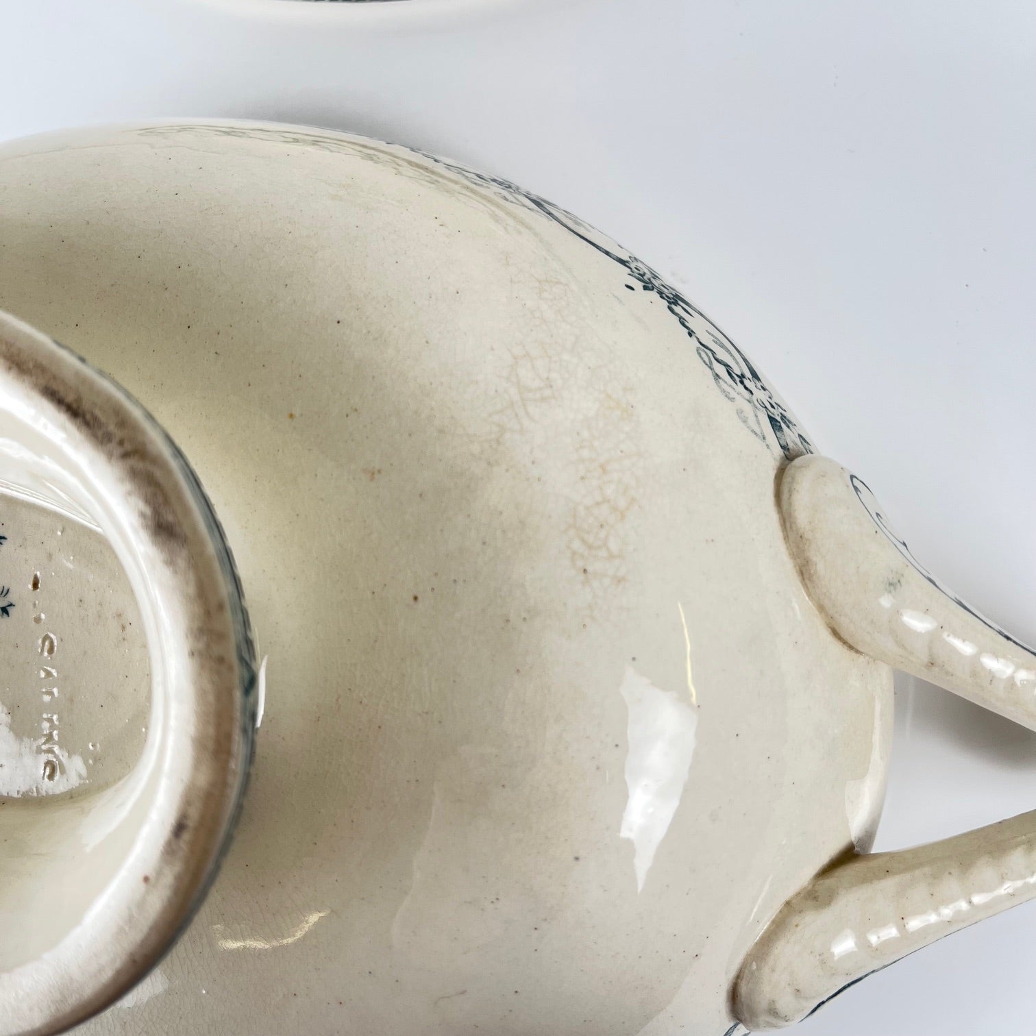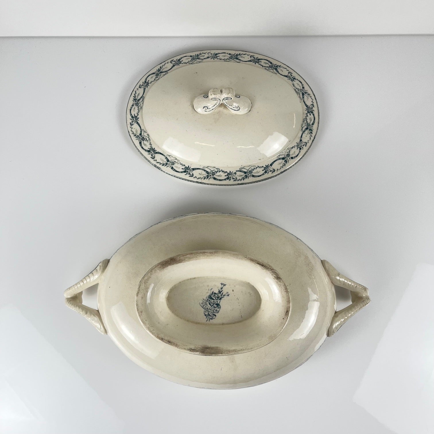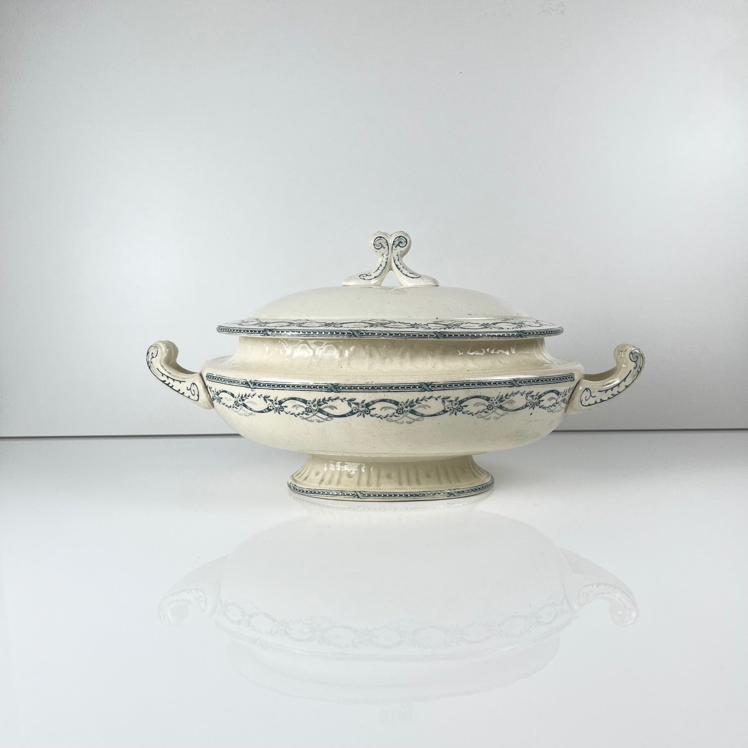 Soupière complète avec couvercle, forme galbée, anses ornées, motif de guirlandes en transfert bleu-vert.