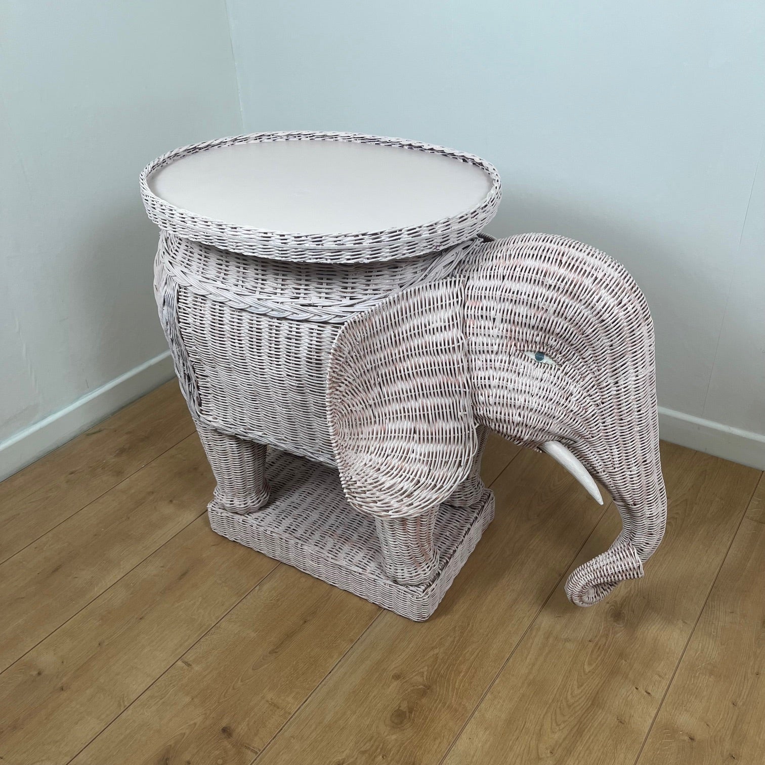 Le plateau circulaire supérieur permet de l’utiliser comme table d’appoint, bout de canapé ou petite table décorative, tout en conservant une forte présence esthétique. Véritable objet de conversation, cet éléphant en rotin incarne l’esprit exotique et raffiné du design des années 70.
