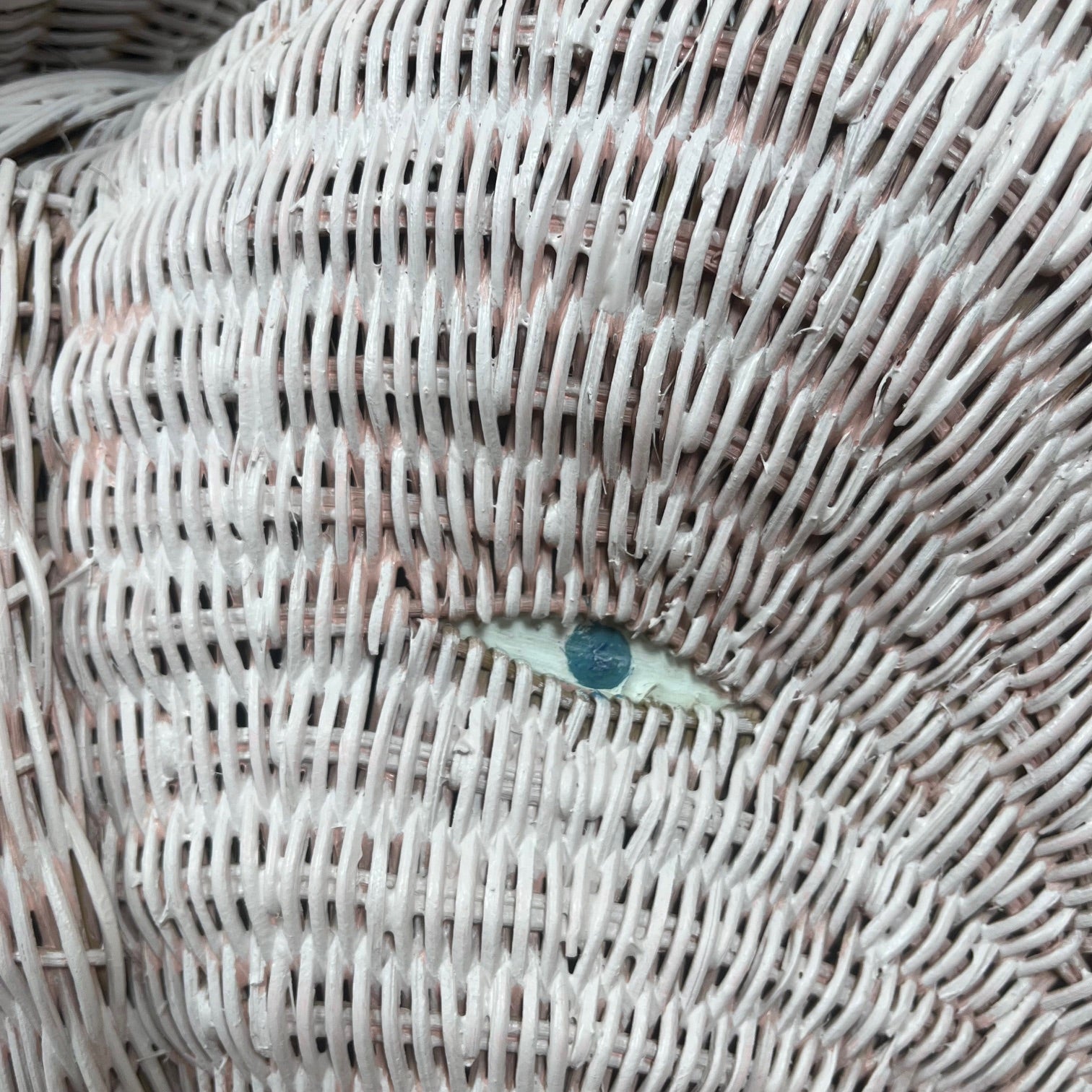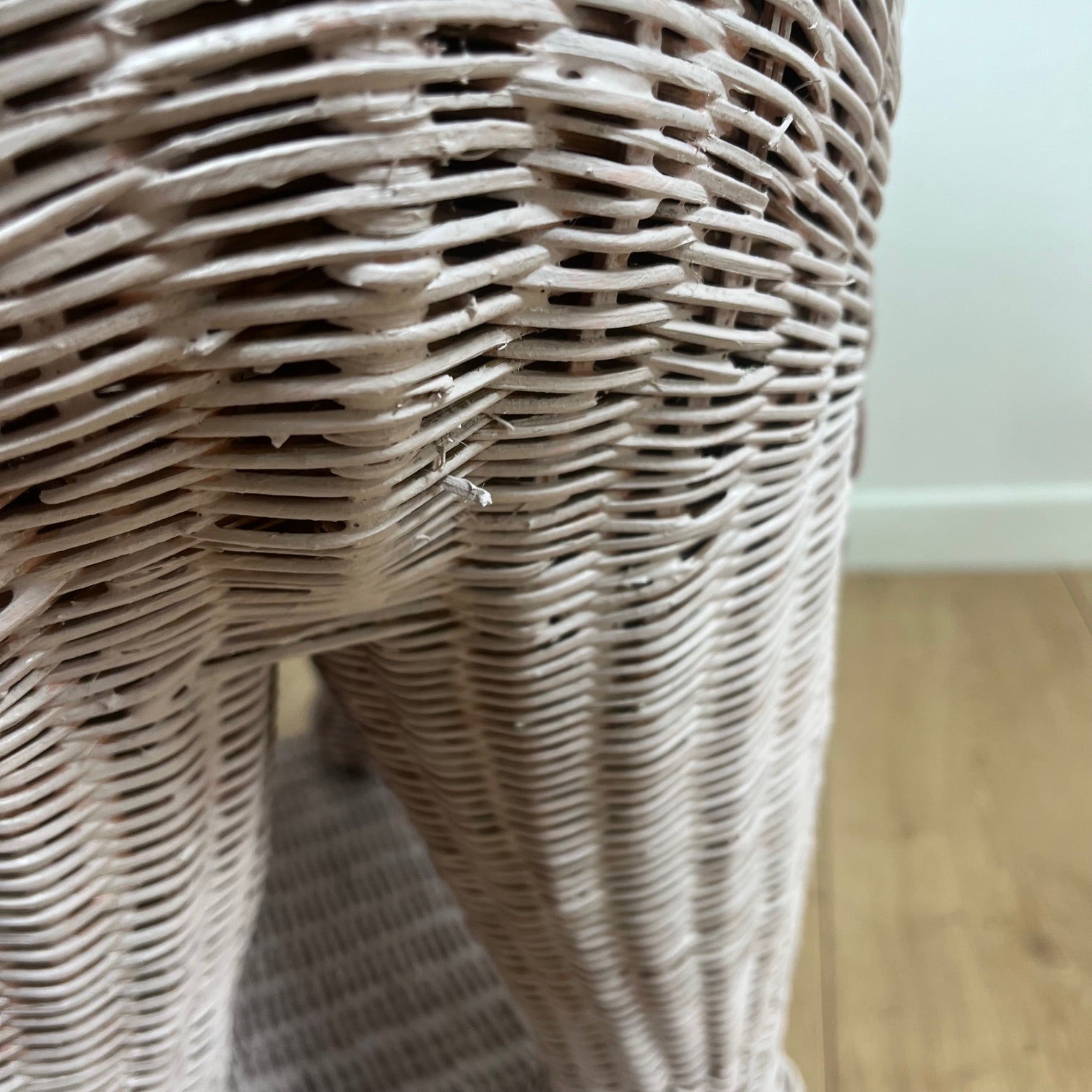 Entièrement réalisée en rotin tressé sur une structure interne en bois, cette pièce se distingue par la qualité de son travail artisanal : larges oreilles délicatement galbées, trompe élégamment enroulée et corps ceinturé d’une frise torsadée décorative typique du design italien de cette période. L’ensemble repose sur un socle rectangulaire qui accentue son allure sculpturale.